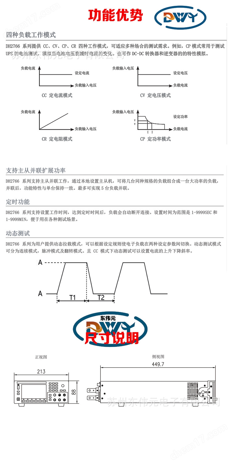 DH2766系列电子负载是一种高精度、高可靠性、可编程直流电子负载,负载采用标准2U半机架尺寸,便于上架使用。
