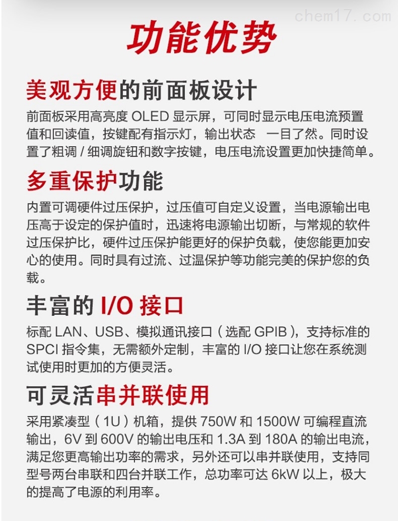 采用紧凑型(1U)机箱,提供750W和1500W可编程直流输出,6V到600V的输出电压和1.3A到180A的输出电流,满足您更高输出功率的需求,另外还可以串并联使用,支持同型号两台串联和四台并联工作,总功率可达6kW以上,极大的提高了电源的利用率。