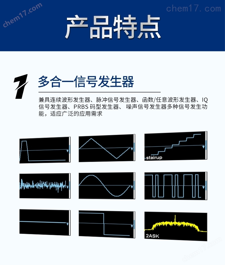 多合一信号发生器· 连续波形发生器——最高频率可达500 MHz· 脉冲信号发生器——最快上升/下降时间可达1 ns,低抖动,脉宽和沿精细可调· 函数/任意波形发生器——6 种标准波形以及高达190多种内置任意波形· IQ信号发生器——支持基带和中频 IQ 信号· PRBS 码型发生器——支持比特率和沿可调的 PRBS 信号· 噪声信号发生器——可输出带宽可调高斯白噪声