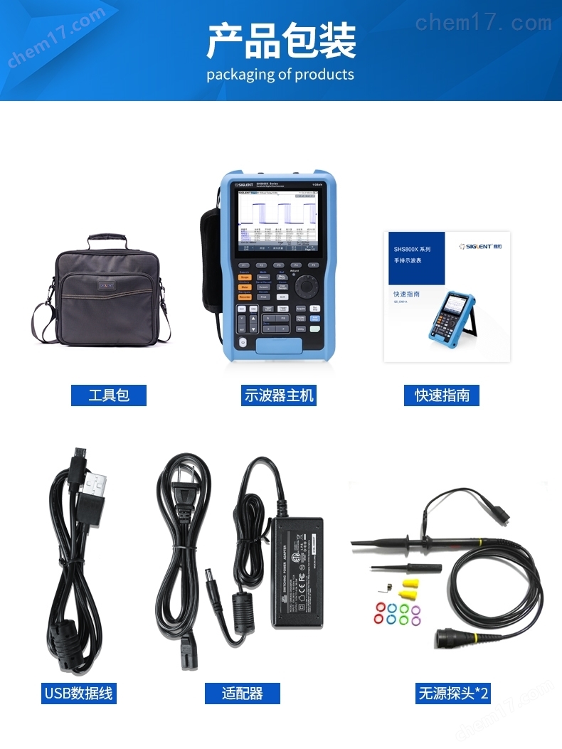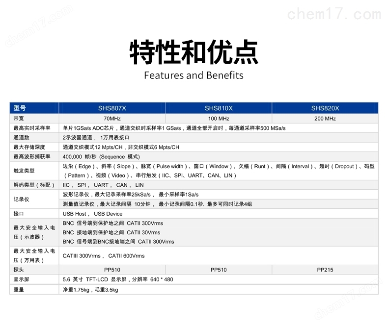 规格参数示波器部分SHS807XSHS810XSHS820X带宽70 MHz100 MHz200 MHz最高实时采样率单片1 GSa/s ADC芯片,通道交织时采样率1 GSa/s,通道全部开启时,每通道采样率500 MSa/s通道数2示波器通道,1万用表接口最大存储深度通道交织模式12 Mpts/CH,非交织模式6 Mpts/CH最高波形捕获率400,000 帧/秒 (Sequence 模式)触发类型边沿(Edge)、斜率(Slope)、脉宽(Pulse width)、窗口(Window)、欠幅(Runt)、间隔(Interval)、超时(Dropout)、码型(Pattern)、视频(Video)、串行触发(IIC、SPI、UART、CAN、LIN)解码类型(标配)IIC, SPI, UART, CAN, LIN记录仪波形记录仪,最大记录采样率25 kSa/s,最小采样率1 Sa/s测量值记录仪,最大记录间隔 10 分钟,最小记录间隔0.1 秒.最多可同时记录4 组接口USB Host, USB Device最大安全输入电压(示波器)BNC 信号端到保护地之间 CATII 300 VrmsBNC 接地端到保护地之间 CATII 30 VrmsBNC 信号端到BNC接地端之间 CATII 300 Vrms最大安全输入电压(万用表)CATIII 300 Vrms, CATII 600 Vrms探头PP510PP510PP215显示屏5.6 英寸 TFT-LCD 显示屏,分辨率 640 * 480重量净重1.75 kg,毛重3.5 kg万用表部分分辨率6000 Counts直流电压测量60 mV600 mV-600 V±1%±15 digit±1%±5 digit交流电压测量60 mV600 mV-600 V±1%±15 digit±1%±5 digit直流电流测量60 mA-600 mA6 A-10 A±1.5%±5 digit±2%±5 digit交流电流测量60 mA600 mA6 A-10 A±1.5%±5 digit±2%±5 digit±3%±5 digit电容测量40 nF400 nF-400 μF±3%±10 digit±4%±5 digit)电阻测量600 ?-6 M?60 M?±1%±5 digit±3%±5 digit导通电阻 < 50 Ω时,蜂鸣器鸣叫二极管测试0-2 V一般特性界面显示5.6 英寸 TFT-LCD 显示屏,分辨率 640 * 480供电方式本机电池供电或外接直流适配器供电,内置可供电锂电池:6900 mAh 电池供电约5.5 小时外置适配器:100-240 V 50/60 Hz输入9 V、4 A输出机身尺寸276 mm * 168 mm * 68 mm配件无源探头两根、电源线、直流适配器、万用表笔型号带宽通道数最高实时采样率存储深度波形刷新率万用表功能记录仪参考价(含税)SHS807X70 MHz21 GSa/s12 Mpts400,000 帧/秒 (Sequence 模式)电压、电流、电阻等 八种常见功能长达22 小时¥3,988SHS810X100 MHz21 GSa/s12 Mpts400,000 帧/秒 (Sequence 模式)电压、电流、电阻等 八种常见功能长达22 小时¥4,688SHS820X200 MHz21 GSa/s12 Mpts400,000 帧/秒 (Sequence 模式)电压、电流、电阻等 八种常见功能长达22 小时¥6,888
