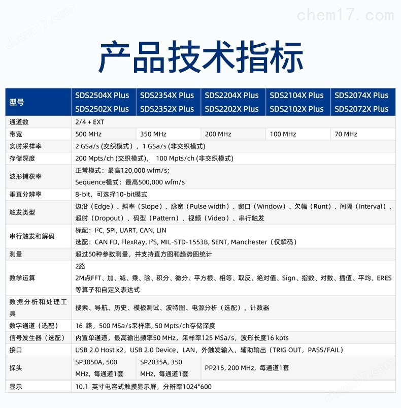 规格参数带宽70 MHz 、100 MHz 、200 MHz、350 MHz、500 MHz实时采样率2 GSa/s通道数2/4 + EXT存储深度200 Mpts/CH最高波形捕获率500,000 wfm/s(Sequence模式)垂直分辨率8 bit,可选10-bit模式输入阻抗(1 MΩ±2%) || (17 pF±2 pF)50 Ω: 50 Ω±1%时基范围1.0 ns/div ~ 1000 s/divROLL: ≥ 50 ms/div触发类型边沿(Edge)、斜率(Slope)、脉宽(Pulse width)、窗口(Window)、欠幅(Runt)、间隔(Interval)、超时(Dropout)、码型(Pattern)、视频(Video)串行数据解码类型标配:IIC, SPI, UART, CAN, LIN选配:CAN FD, FlexRay, IIS, MIL-STD-1553B,SENT,Manchester16路数字通道(选配)500 MSa/s采样率, 50 Mpts/通道存储深度数学运算 2路:2M点FFT、加、减、乘、除、积分、微分、平方根、平均、ERES和自定义表达式自动测量数十种自动测量功能,支持测量统计、Gating 测量、Math测量、History 测量、Ref 测量。支持对测量参数的直方图和趋势图统计接口USB 2.0 Host x2,USB 2.0 Device,LAN,外触发输入,辅助输出(TRIG OUT,PASS/FAIL)屏幕10.1 英寸电容式触摸显示屏,分辨率1024*600最大输入电压1 MΩ ≤ 400 Vpk(DC + AC), DC~10 kHz50 Ω ≤ 5 Vrms, ±10 V Peak尺寸宽×高×厚 = 352 mm×224 mm×111 mm重量2通道净重3.3 kg, 毛重4.8 kg4通道净重3.9 kg, 毛重5.4 kg型号模拟带宽通道数最高实时采样率最高波形捕获率最大存储深度参考价(含税)SDS2504X Plus500 MHz4 + EXT2 GSa/s500,000 wfm/s200 Mpts/ch¥26,880SDS2502X Plus500 MHz2 + EXT2 GSa/s500,000 wfm/s200 Mpts/ch¥22,980SDS2354X Plus350 MHz4 + EXT2 GSa/s500,000 wfm/s200 Mpts/ch¥18,680SDS2352X Plus350 MHz2 + EXT2 GSa/s500,000 wfm/s200 Mpts/ch¥15,280SDS2204X Plus200 MHz4 + EXT2 GSa/s500,000 wfm/s200 Mpts/ch¥13,580SDS2202X Plus200 MHz2 + EXT2 GSa/s500,000 wfm/s200 Mpts/ch¥9,980SDS2104X Plus100 MHz4 + EXT2 GSa/s500,000 wfm/s200 Mpts/ch¥11,480SDS2102X Plus100 MHz2 + EXT2 GSa/s500,000 wfm/s200 Mpts/ch¥9,080SDS2074X Plus70 MHz4 + EXT2 GSa/s500,000 wfm/s200 Mpts/ch电商专卖系列SDS2072X Plus70 MHz2 + EXT2 GSa/s500,000 wfm/s200 Mpts/ch电商专卖系列