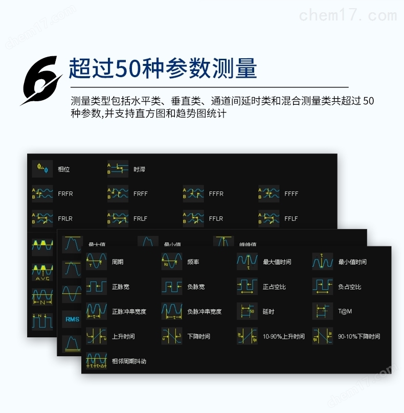 便捷的测量参数统计功能参数统计功能可显示任意参数的五种测量值:当前值、平均值、最小值、最大值、标准差;可同时测量统计12种不同的参数。直方图统计可以直观地显示参数的概率分布情况;趋势图可反应参数随时间的变化规律。此外,对水平方向上的测量(如周期、脉宽等),摒弃了传统的一帧只获得一个测量值的方法,将一帧中的所有特定水平项目的测量值都计算出来并纳入统计,大大提高了测试效率。