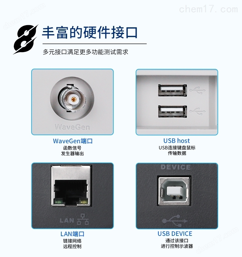 波形捕获率达500,000 wfm/s优秀的用户界面和用户体验· 配备10.1 英寸TFT-LCD 大显示屏,分辨率1024*600;· 电容式触摸屏,专门为示波器操作定义的各种手势,极大地提高了仪器操控效率;· 内嵌WebServer,可直接通过网页远程访问和操作示波器;· 支持鼠标和键盘操作