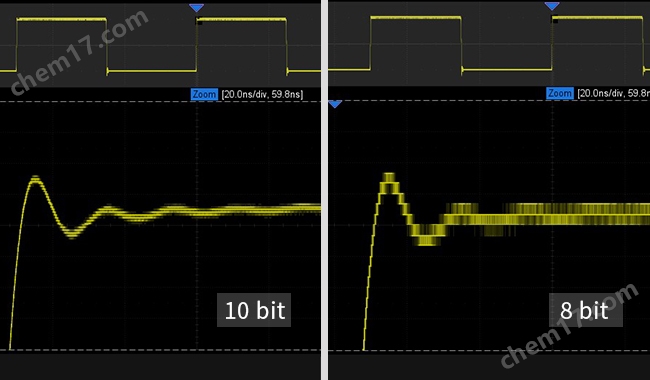 10-bit模式,更好地还原波形细节垂直分辨率用来描述数字示波器中ADC的位数,即位数越高,垂直分辨率越高,显示波形就越接近真实波形。如图,分别是 8-bit 模式和 10-bit 模式下的波形图。