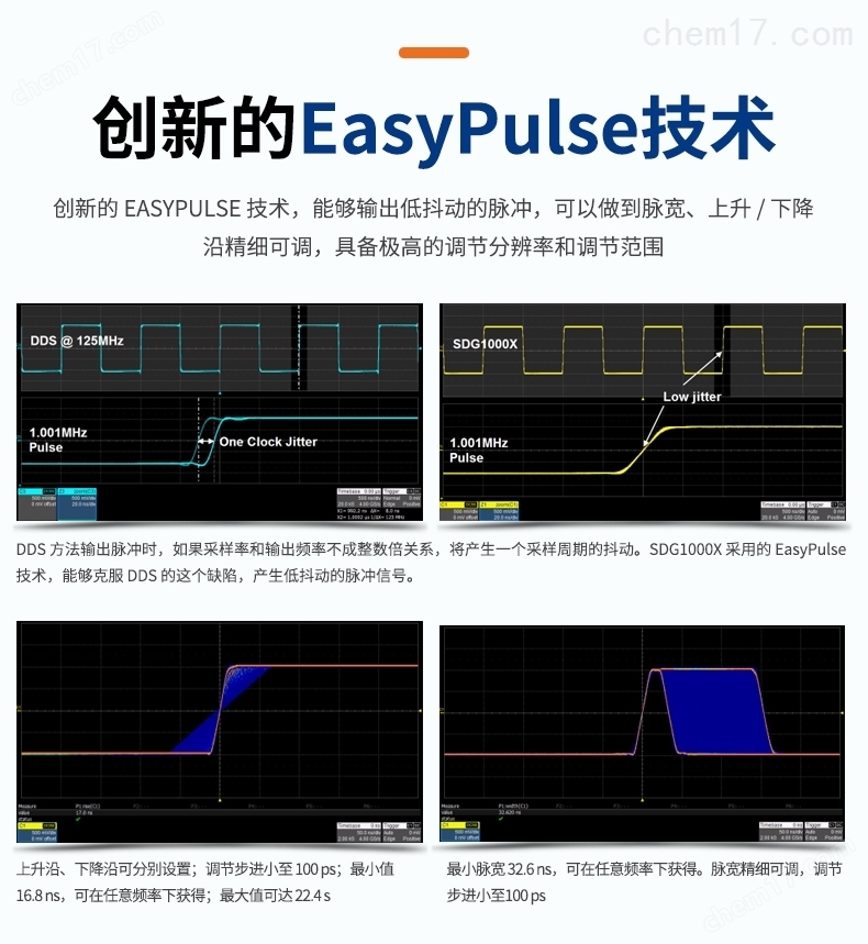 创新的 EasyPulse 技术DDS方法输出方波/脉冲时, 如果采样率和输出频率不成整数倍关系,将产生一个采样周期的抖动。采用EasyPulse技术可克服这个缺陷;产生低抖动的方波和脉冲信号,此外还具有以下优势: · 脉冲频率最高可达12.5 MHz· 上升和下降时间分别可设置最快可达16.8 ns· 脉宽精细可调,最小可达32.6 ns· 占空比低至0.001%· 低抖动