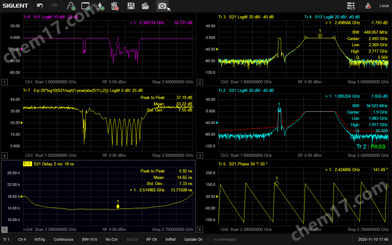从S参数测试到平衡-不平衡测试SNA5000X系列支持在多个窗口添加多条迹线进行全4端口S参数测试,并且具备多种显示格式,比如 Log Mag,Lin Mag,Phase,Delay,Smith,SWR,Polar等,可以方便快捷地分析被测物的传输系数,反射系数,驻波比,阻抗匹配,相位,延时等参数。在生产线验证天线,滤波器等的特性时,还可以保存参考迹线或者添加Limit模板进行通过失败测试,有利于提高生产效率。SNA5000X系列还支持端口阻抗变换功能,比如在测试有源差分放大器时,可将输入输出端口进行阻抗变换,从而进行差分(平衡)测量(比如Scc,Sdd,Scd,Sdc等参数)。 此功能还可应用于差分线缆等其他差分类测试。