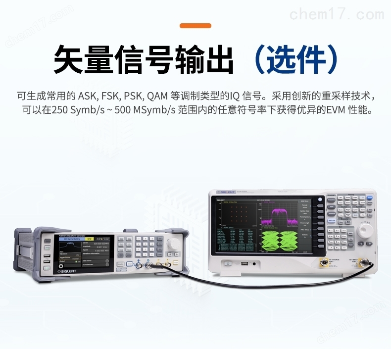 矢量信号输出可生成常用的 ASK, FSK, PSK, QAM 等调制类型的IQ 信号。 采用创新的重采样技术, 可以在250 Symb/s ~ 500 MSymb/s 范围内的任意符号率下获得优异的EVM 性能。内建的数字正交调制器可将IQ 信号的载波调制到1 GHz 范围内的任意频点;可使用上位机软件EasyIQ 来生成各种类型的IQ 信号。