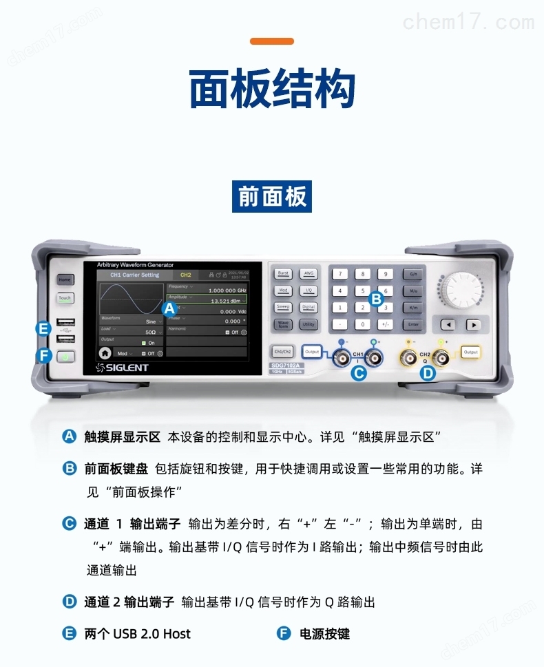 多功能信号发生器· SDG7000A是一款集多种信号发生器功能于一体的产品。它可以产生直流到1 GHz范围的连续波,在一定场合下取代射频信号源;· 采用了鼎阳的TrueArb逐点任意波形发生技术,可以在0.01 Sa/s ~ 2.5 GSa/s的范围里任意设置采样率,输出低抖动的任意波;· 可以产生I/Q矢量信号,最大可设置的带宽超过500 MHz;· 基于EasyPulse脉冲发生技术,可以产生脉宽最小只有1 ns的低抖动脉冲;· 可以产生带宽可调的高斯噪声;· 可以产生伪随机码;