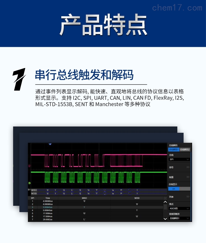 便捷的测量参数统计功能参数统计功能可显示任意参数的五种测量值:当前值、平均值、最小值、最大值、标准差;可同时测量统计12种不同的参数。直方图统计可以直观地显示参数的概率分布情况;趋势图可反应参数随时间的变化规律。此外,对水平方向上的测量(如周期、脉宽等),摒弃了传统的一帧只获得一个测量值的方法,将一帧中的所有特定水平项目的测量值都计算出来并纳入统计,大大提高了测试效率。