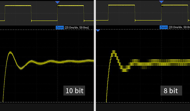 10-bit模式,更好地还原波形细节垂直分辨率用来描述数字示波器中ADC的位数,即位数越高,垂直分辨率越高,显示波形就越接近真实波形。如图,分别是 8-bit 模式和 10-bit 模式下的波形图。