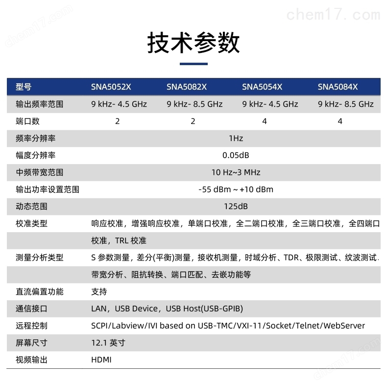 规格参数最高频率4.5 GHz/8.5 GHz频率分辨率1 Hz幅度分辨率0.05 dB中频带宽范围10 Hz~3 MHz输出功率设置范围-55 dBm ~ +10 dBm动态范围125 dB 校准类型响应校准,增强响应校准,单端口校准,全二端口校准,全三端口校准,全四端口校准,TRL校准是通信接口LAN,USB Device,USB Host(USB-GPIB)远程控制SCPI / Labview / IVI based on USB-TMC / VXI-11/ Socket / Telnet / Webserver触摸控制Multi Touch,Mouse,Keyboard屏幕尺寸12.1 英寸视频输出HDMI测量分析类型S参数测量,差分(平衡)测量,接收机测量,时域分析、极限测试、纹波测试、带宽分析、阻抗转换、端口匹配、去嵌入功能等型号频率范围端口数频率分辨率幅度分辨率中频带宽范围输出功率设置范围动态范围SNA5052X9 kHz~4.5 GHz21 Hz0.05 dB10 Hz~3 MHz-55 dBm ~ +10 dBm125 dBSNA5082X9 kHz~8.5 GHz21 Hz0.05 dB10 Hz~3 MHz-55 dBm ~ +10 dBm125 dBSNA5054X9 kHz~4.5 GHz41 Hz0.05 dB10 Hz~3 MHz-55 dBm ~ +10 dBm125 dBSNA5084X9 kHz~8.5 GHz41 Hz0.05 dB10 Hz~3 MHz-55 dBm ~ +10 dBm125 dB