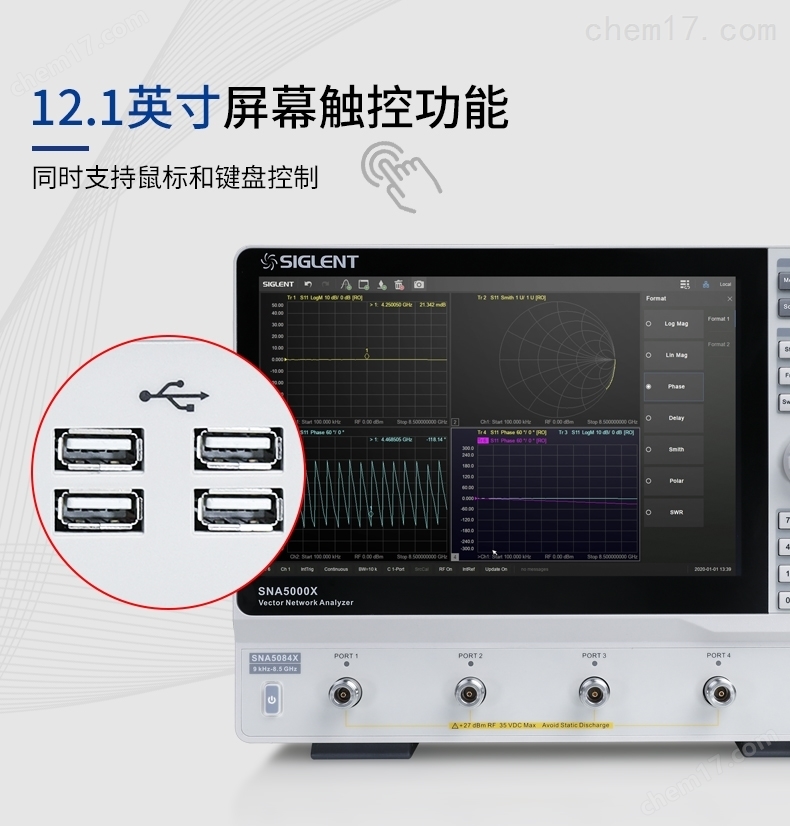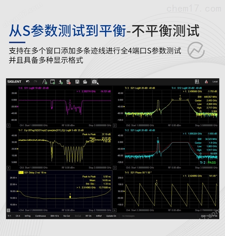 从S参数测试到平衡-不平衡测试SNA5000X系列支持在多个窗口添加多条迹线进行全4端口S参数测试,并且具备多种显示格式,比如 Log Mag,Lin Mag,Phase,Delay,Smith,SWR,Polar等,可以方便快捷地分析被测物的传输系数,反射系数,驻波比,阻抗匹配,相位,延时等参数。在生产线验证天线,滤波器等的特性时,还可以保存参考迹线或者添加Limit模板进行通过失败测试,有利于提高生产效率。SNA5000X系列还支持端口阻抗变换功能,比如在测试有源差分放大器时,可将输入输出端口进行阻抗变换,从而进行差分(平衡)测量(比如Scc,Sdd,Scd,Sdc等参数)。 此功能还可应用于差分线缆等其他差分类测试。