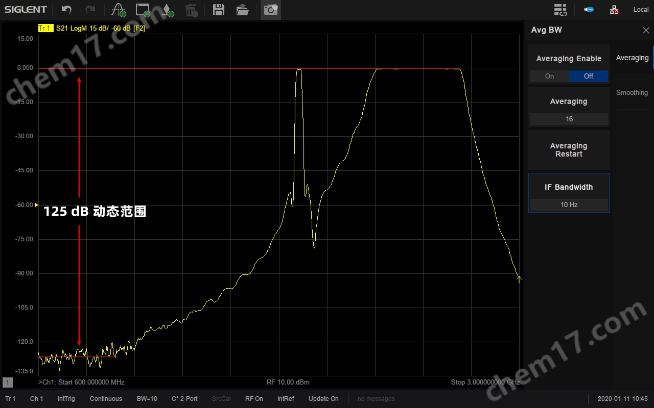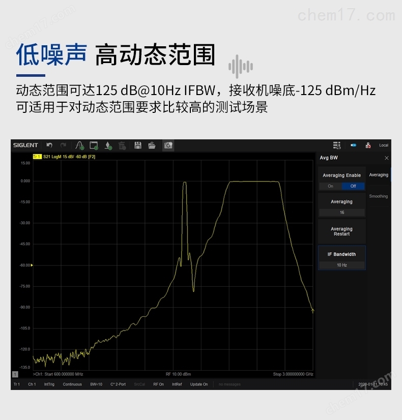 低噪声,高动态范围系统动态范围是VNA一个非常重要的指标,它是VNA源的最大输出功率与测试端口本底噪声的差值。SNA5000X的动态范围可达125 dB@10Hz IFBW,接收机噪底-125 dBm/Hz,可适用于对动态范围要求比较高的测试场景,比如同时测量滤波器的通带和带外抑制性能。