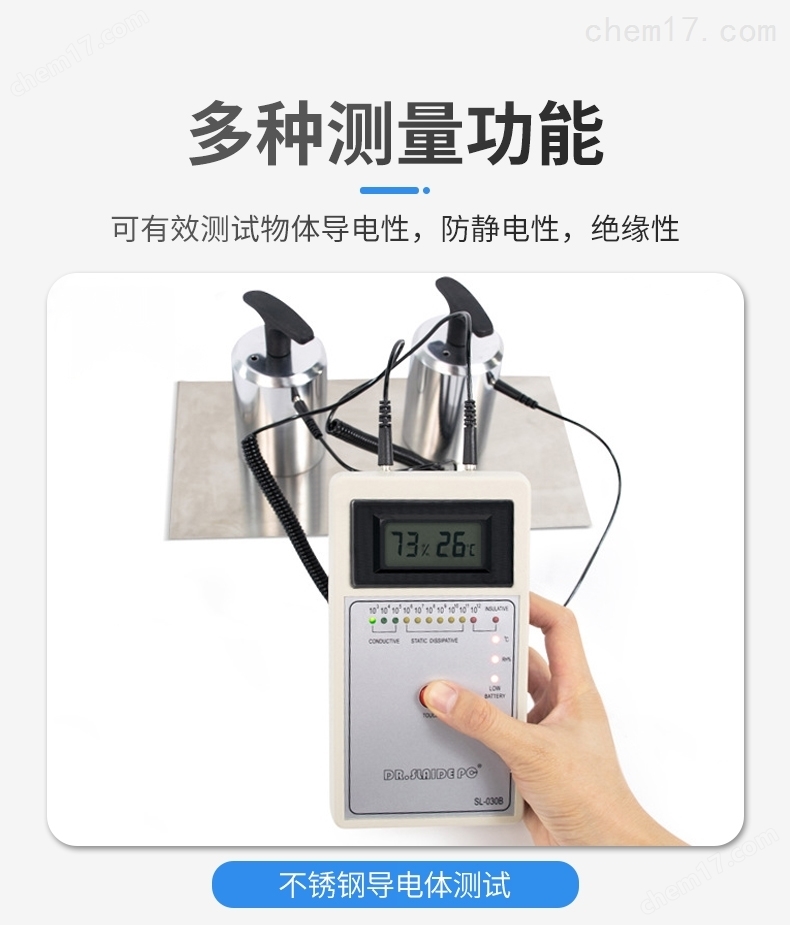进口斯莱德SL-030B数显重锤式表面电阻测试仪是通过测量物体的表面电阻,从而检测物体的防静电能力,SL-030B数显重锤式表面电阻测试仪遵循ASTM标准D-257测试方法,测试时只需把两个重锤放置在需要测量的物体表面及按下红色的按键,仪器上会显示出所测物的表面具体电阻值。