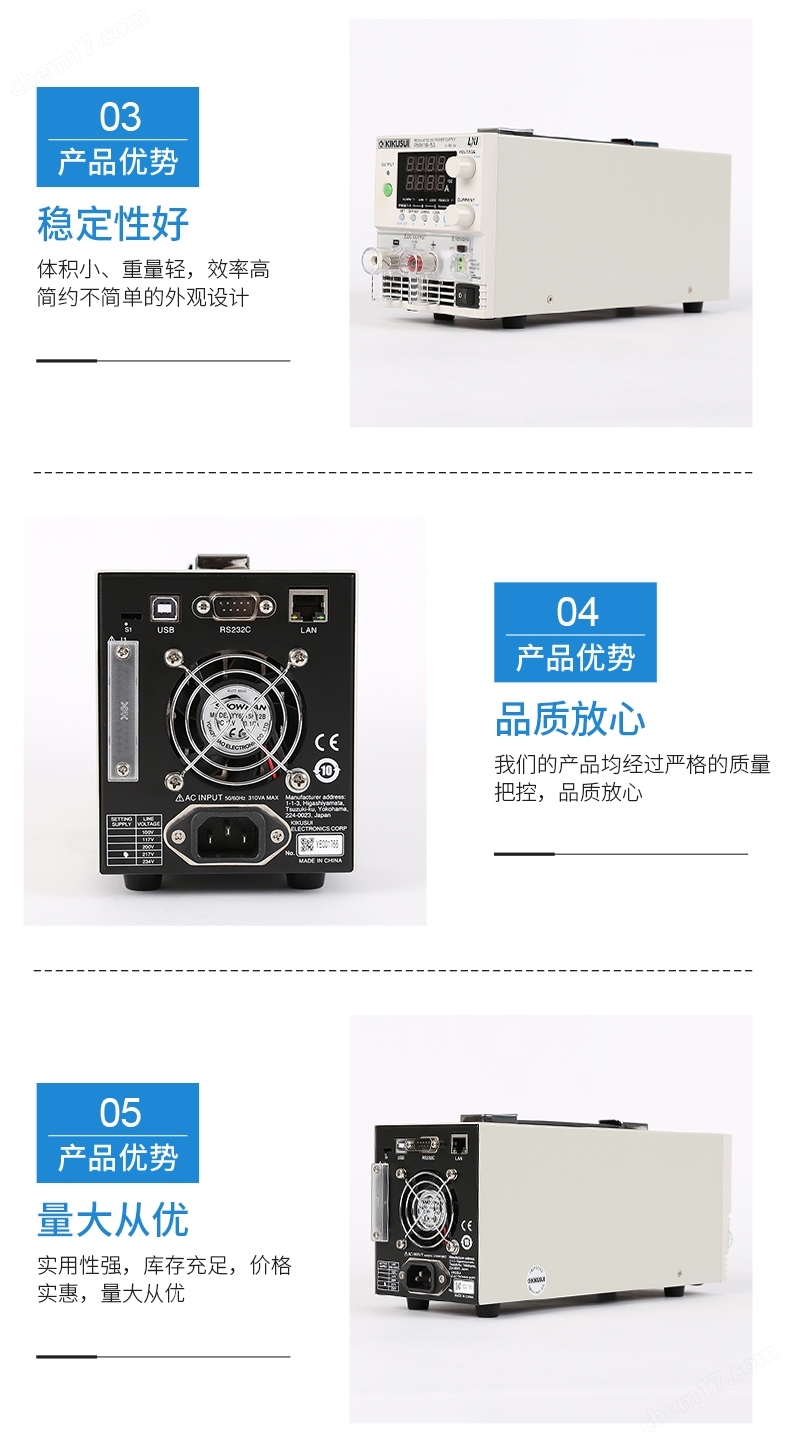 还有就是标配有*的通信接口群、LAN、USB、RS232C。LAN通信可通过电脑、智能手机、平板电脑等的网络浏览器对嵌入PMX-A系列的网 络服务器进行访问,从而对电源进行控制与监控。还有得到LXI(LAN eXtention for Instrumentation)认证,在测试系统用LAN接续时的设定可容易进行。