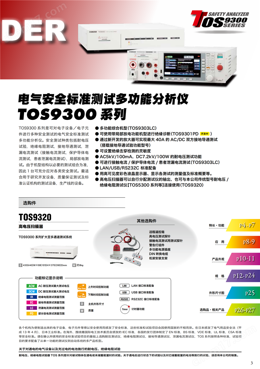 TOS9303菊水耐压测试仪是一款高性能安规试验仪,可帮助您执行符合各种标准的电气安全测试。此系列涵盖高压绝缘耐压测试,绝缘电阻,接地阻抗,泄漏电流(接触电流和保护导体电流)以及局部放电测试。该多功能测试仪提高了生产效率并节约了宝贵的生产空间,是研发,质量保证,生产线和实验室的理想选择。