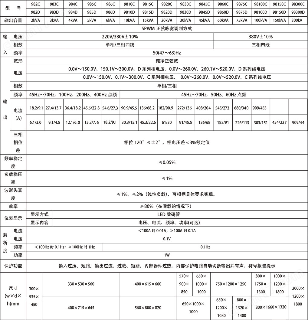 JJ98C、D系列电源是JJ98B系列的改进产品,以微处理器为核心,电力电子半导器件为功率输出单元,采用了数字分频、D/A转换、瞬时值反馈、正弦脉宽调制、IGBT输出等新技术及模块化结构,具有负载适应性强、输出波行品质好、操作简便、体积小、重量轻等特点,具有过流、过载、过热、短路等保护功能,以保证电源可靠运行。可广泛适应于需要模拟各种电力环境及特殊要求的实验室、